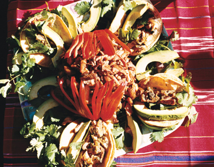 Slow-Cooked Carnitas Tacos Let guests customize their pork tacos by laying out avocado slices, cilantro sprigs, sliced red bell peppers, and tomatillo salsa.